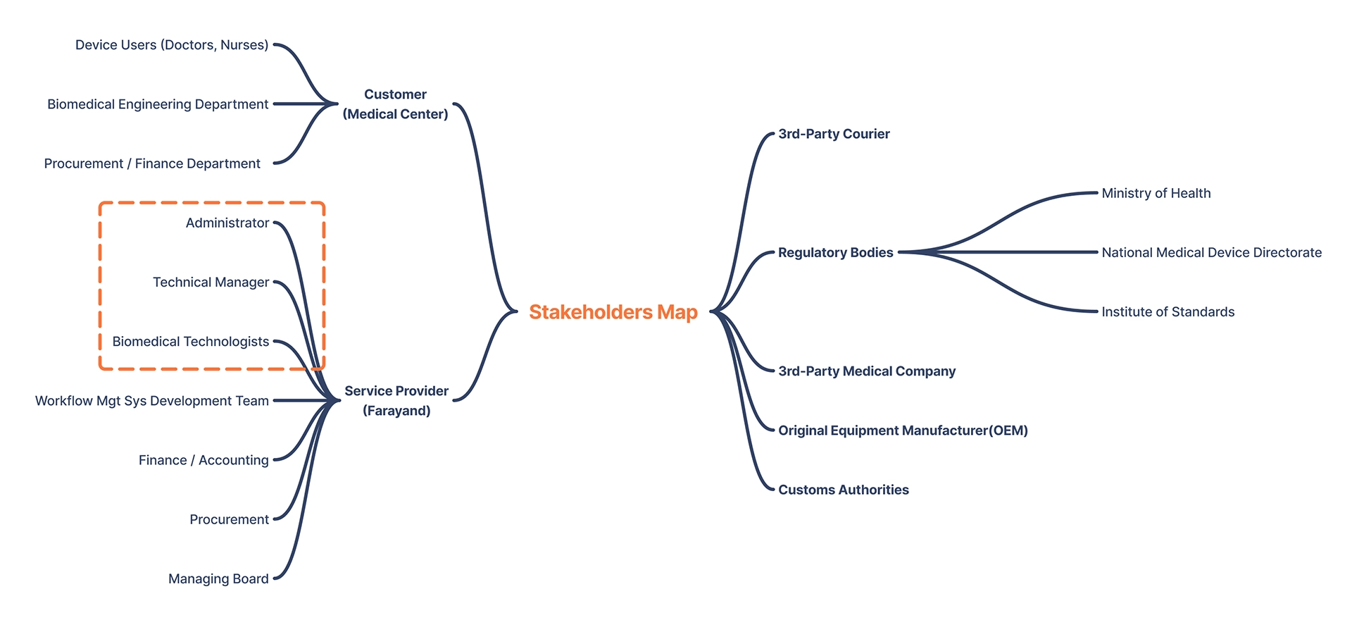 For this project, I worked directly with real users, gathering insights through observation and feedback rather than fictional personas. To ground the design, I mapped all stakeholders involved in the service ecosystem, from hospital staff and regulators to service company roles and logistics partners.