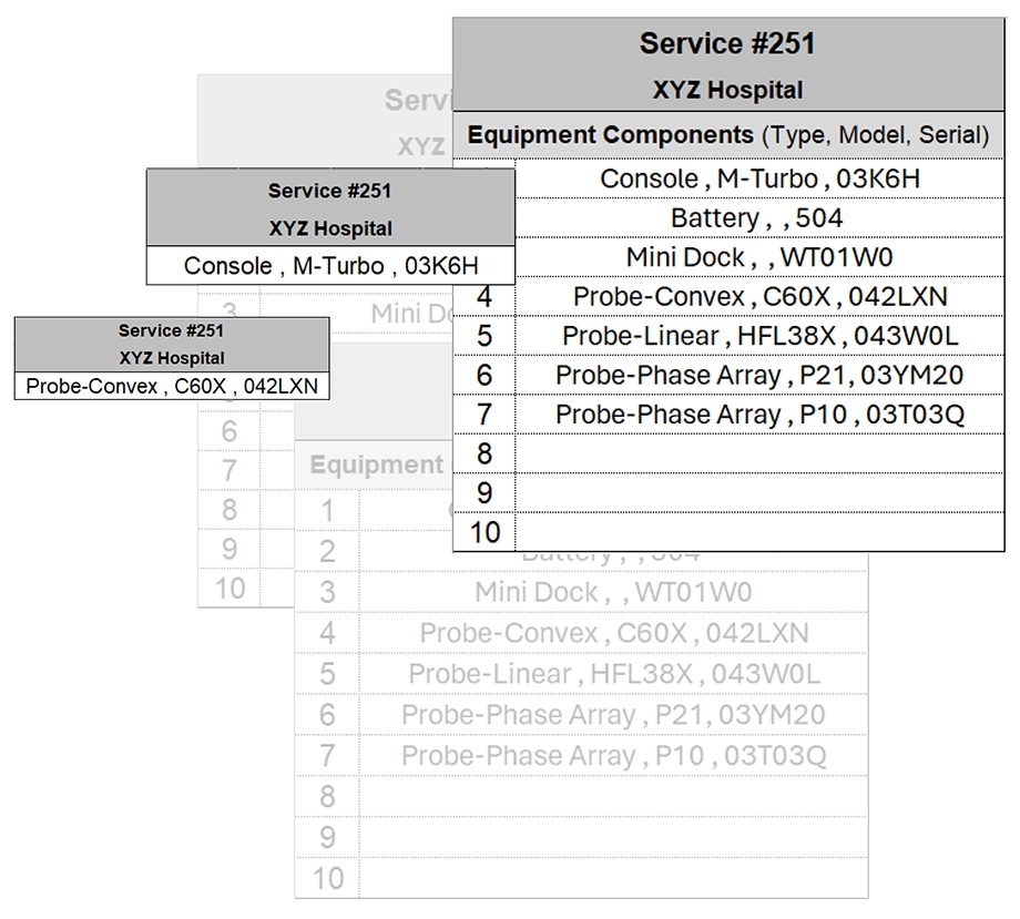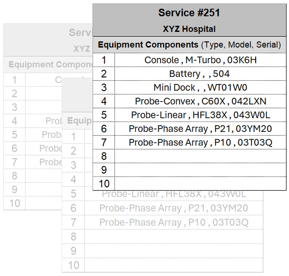 After a few weeks of observation, I noticed another issue: when a component, say a probe, was separated from its main unit for repair, technologists often had trouble locating the main device record in the system. To fix this, I updated the process so a set of labels was printed for every individual component. Adding the customer name to the label reduced the cognitive load and made tracing items faster.