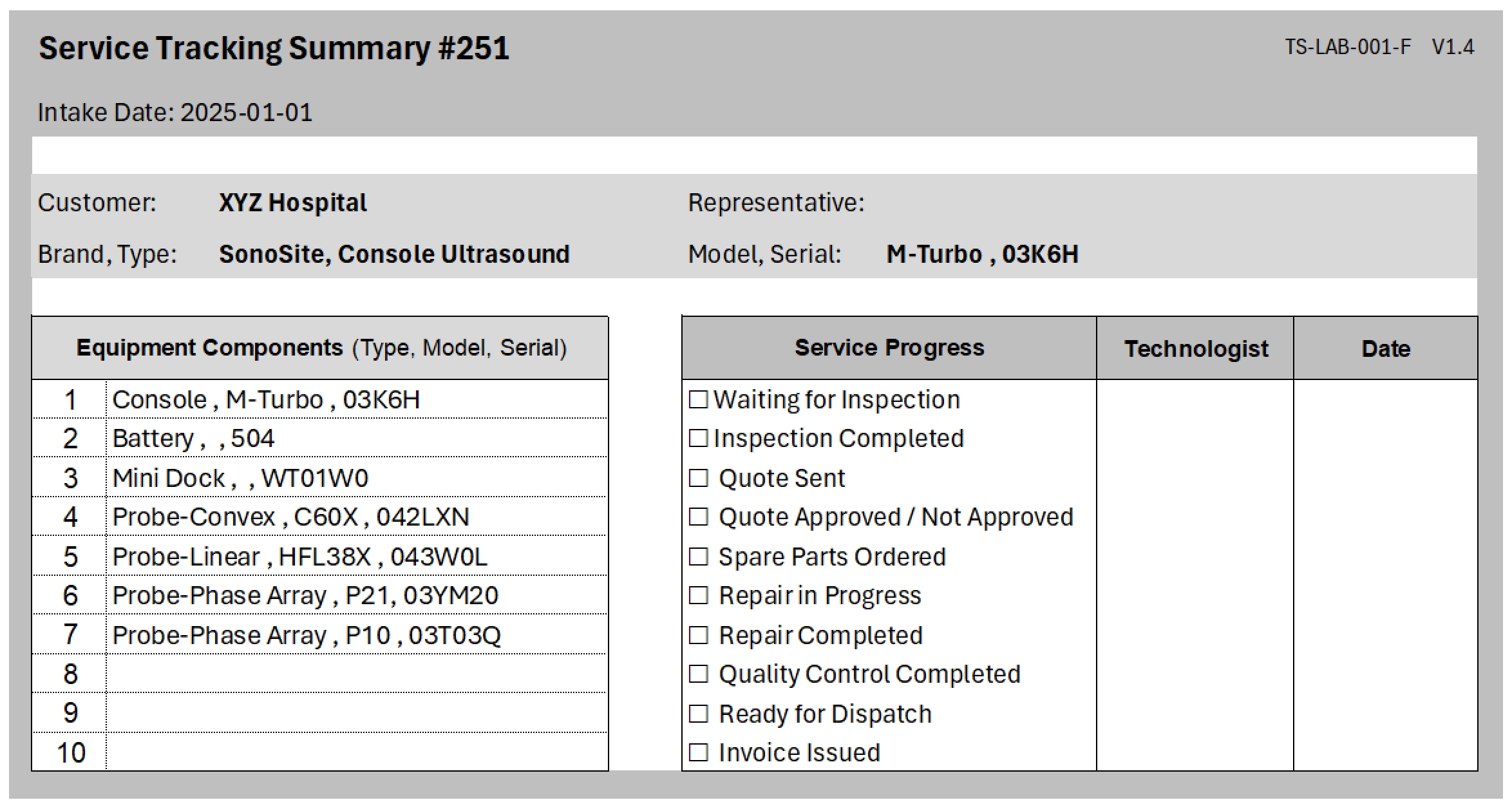 At this point, I realized we needed a quick way for anyone in the team to know the full context of a device at a glance. So, I designed a service summary sheet that was attached to each cabinet during equipment service cycle. It included key details like service number, intake date, customer name, main unit and accessories details and also the current service stage. It brought order to the workspace and made communication between technologists and the admin much smoother.